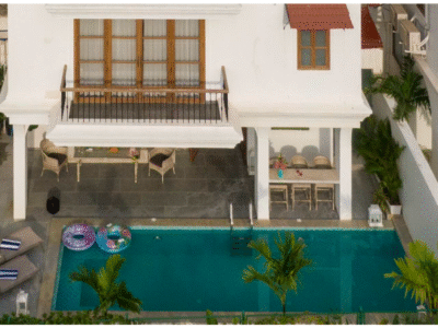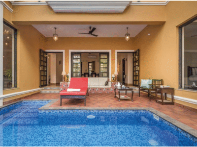 Ikigai Rose Manor, Vagator — Luxury 4BR private-pool villa near North Goa’s best beaches. Sunlit living with French windows, terrace with lush views, 4 AC ensuite bedrooms, fully equipped kitchen, dining for 8, plus housekeeping, caretaker & power backup. Sleeps 8–10.