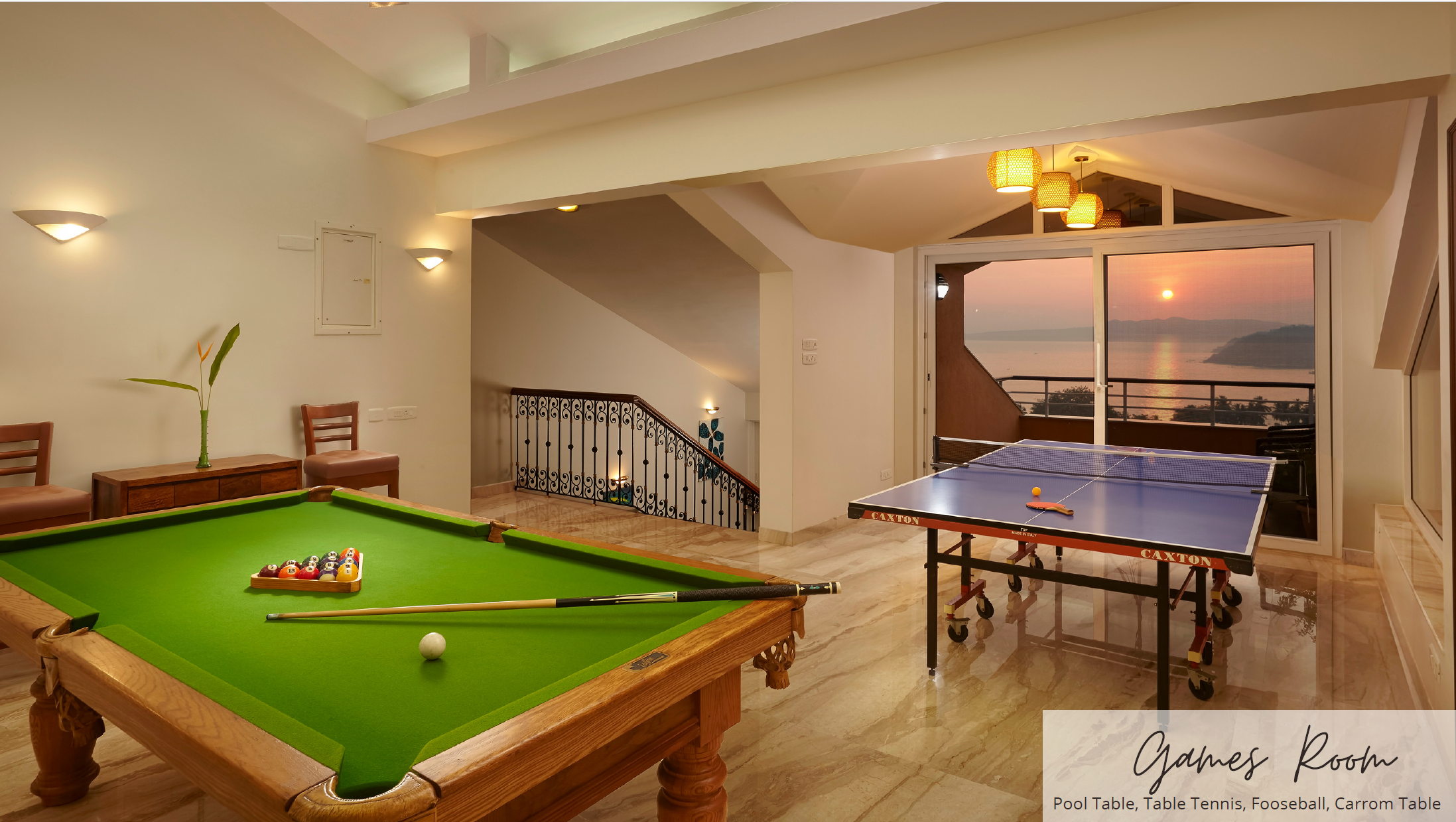 Games room: table tennis, Canadian pool table, foosball, carrom